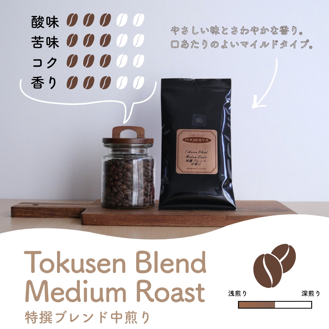 やさしい味とさわやかな香り。口あたりのよいバランスのとれたマイルドタイプ。