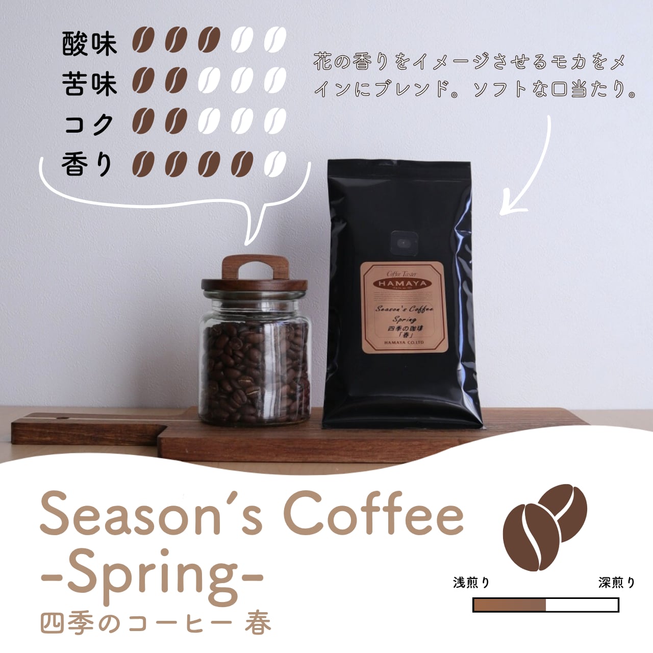 花の香りをイメージさせるモカをメインにブレンドした、ソフトな口当たりのコーヒーです。